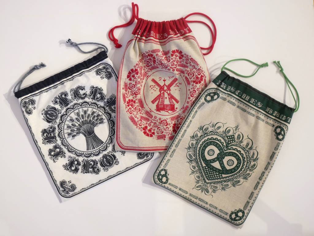 Brotbeutel aus Siebdruckstoffen mit Brezel- und Mühlenmotiven