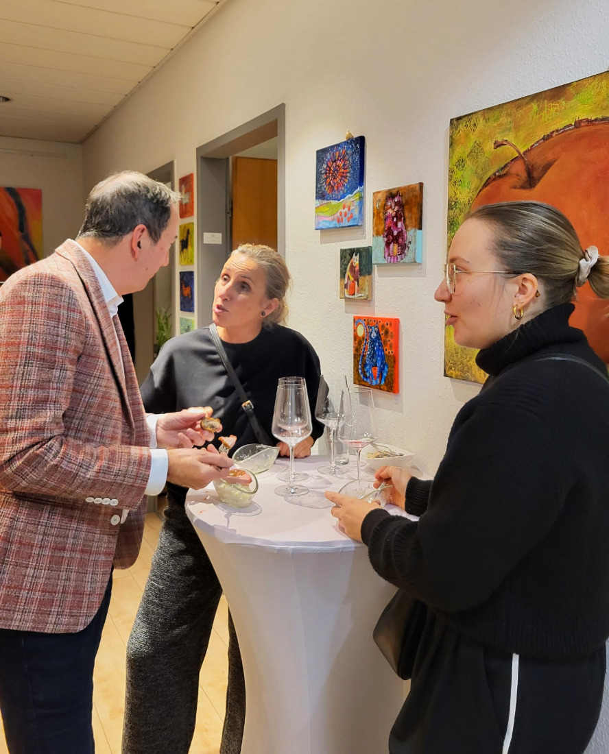 Angeregte Gespräche, eine entspannte Atmosphäre in unserer Bürogalerie und ein gutes Glas gehören bei uns ebenfalls dazu.